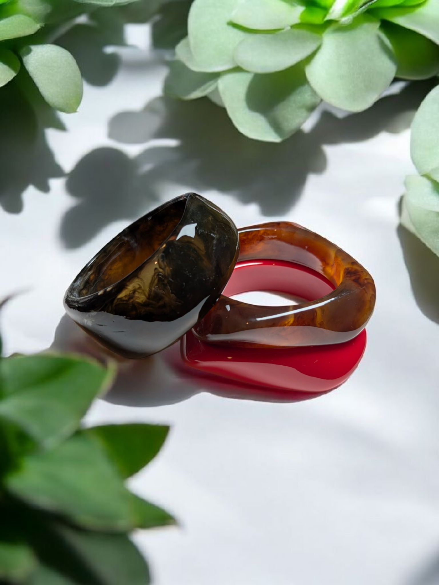 Add a touch of bold elegance to your look with this acrylic bracelet. Featuring a rich swirl of smoky amber and deep espresso tones, this sculpted bangle captures the beauty of natural stone in a lightweight, comfortable design. Each piece has its own unique marbled pattern, making it truly one-of-a-kind.