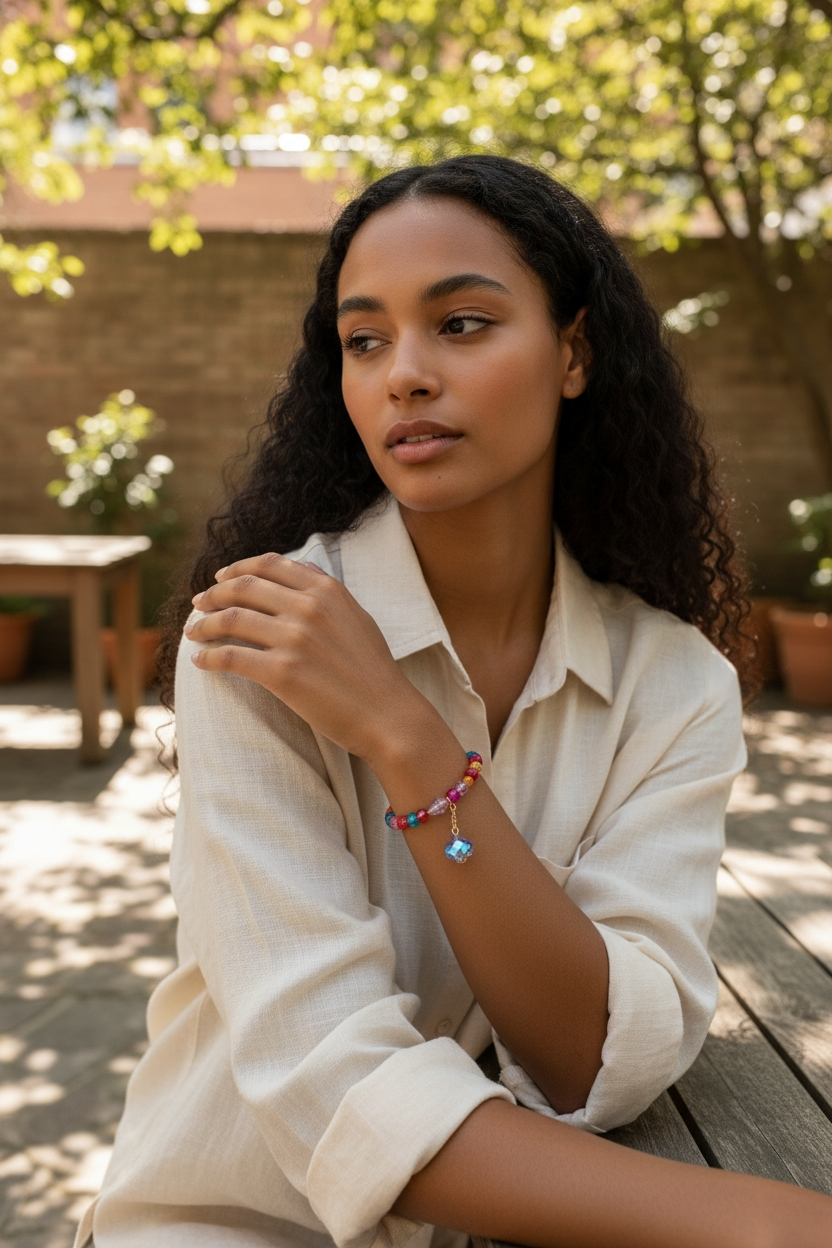 Each bracelet measures 7.5 inches, offering a comfortable fit, and can be customized to your preferred length for the perfect finish. Whether worn alone or stacked, this piece brings a joyful splash of color and a touch of elegance to any outfit.