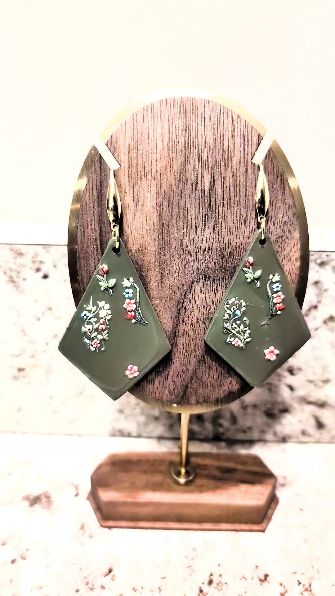 Hand painted Earrings in Olive Green with floral detail. These unique earrings will make a bold statement. Lightweight and gold plated hooks finish the look.