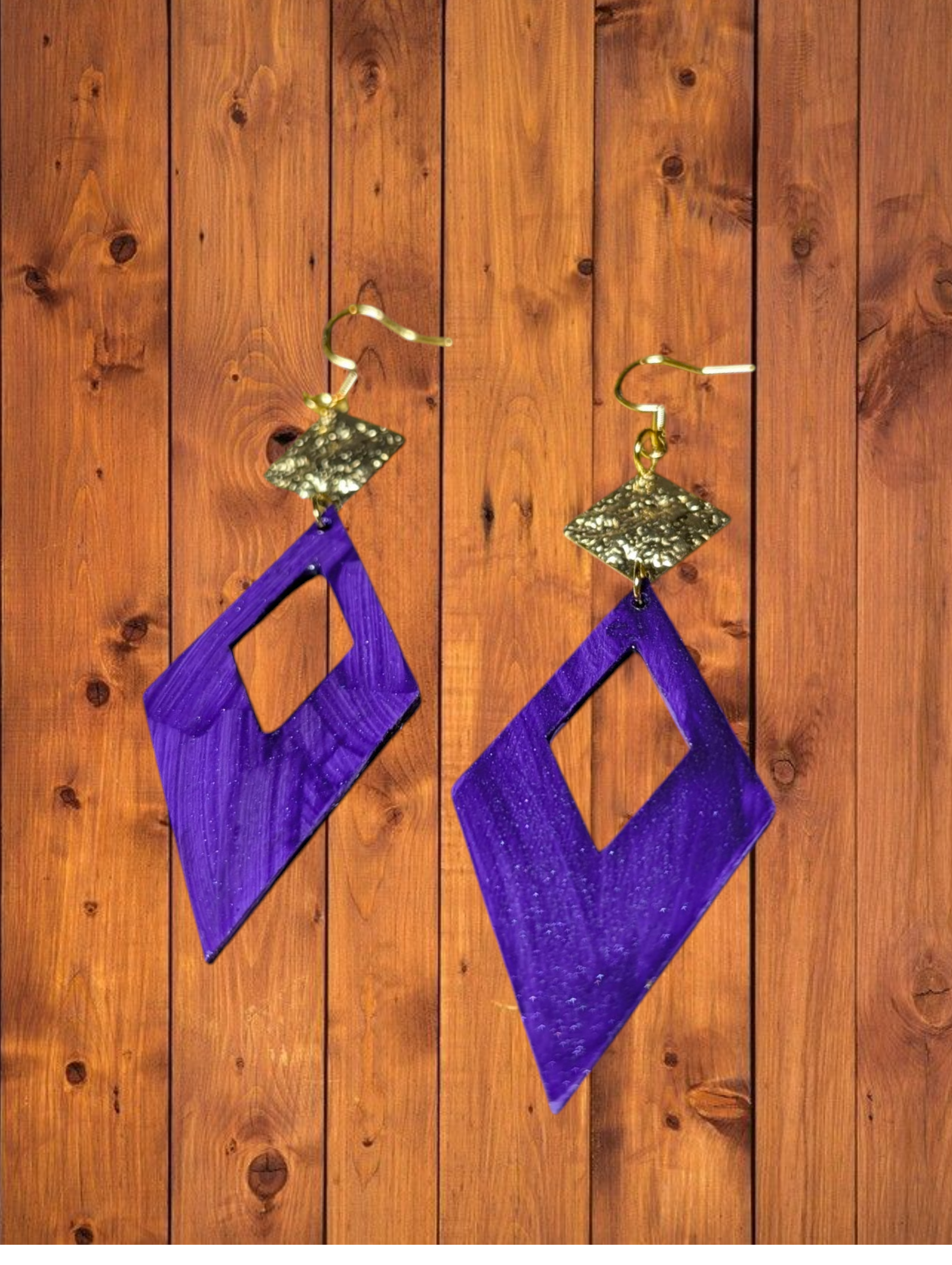 Handpainted purple earrings with pronounced brush strokes for a cool effect. Purple glitter is also added and gold plated diamond shaped findings